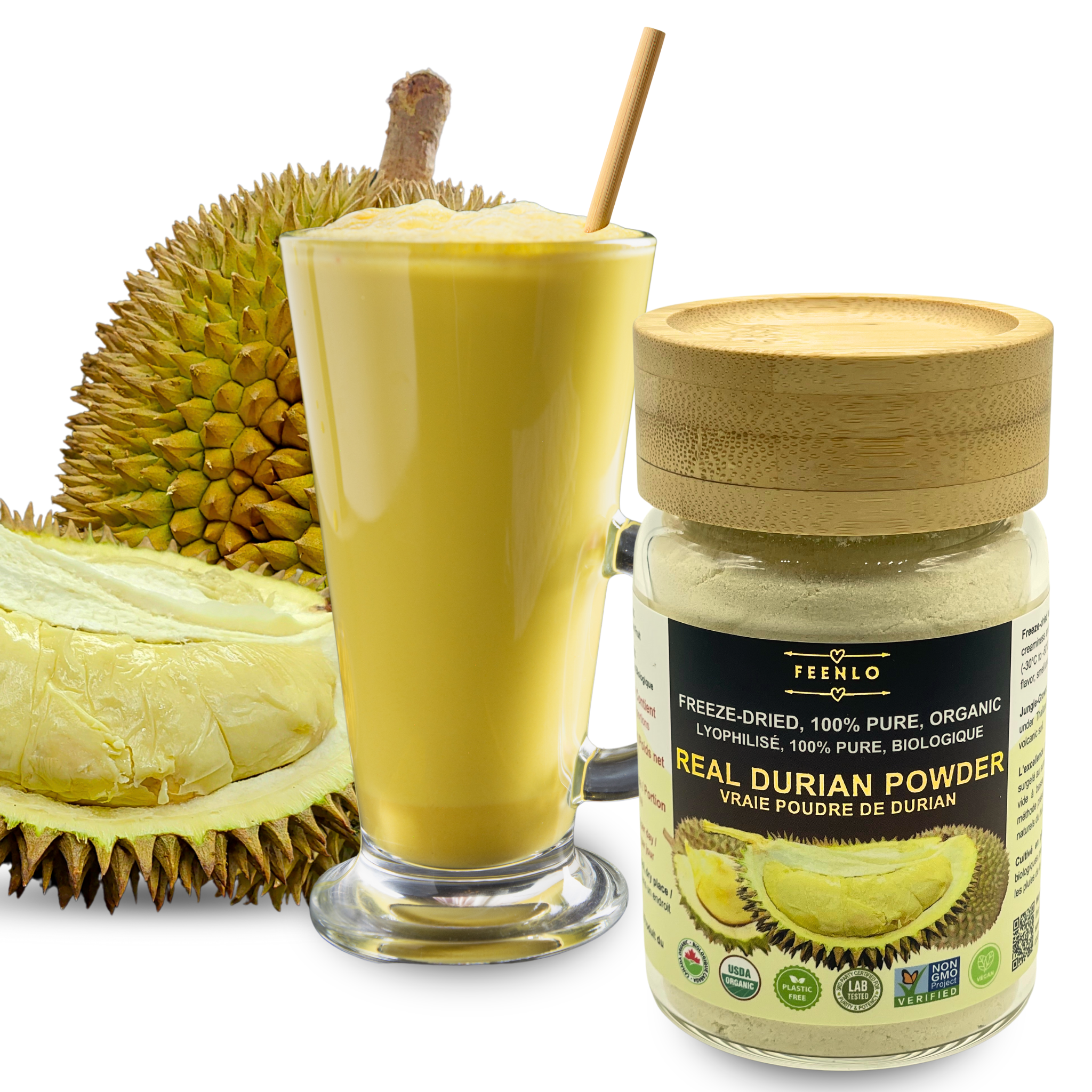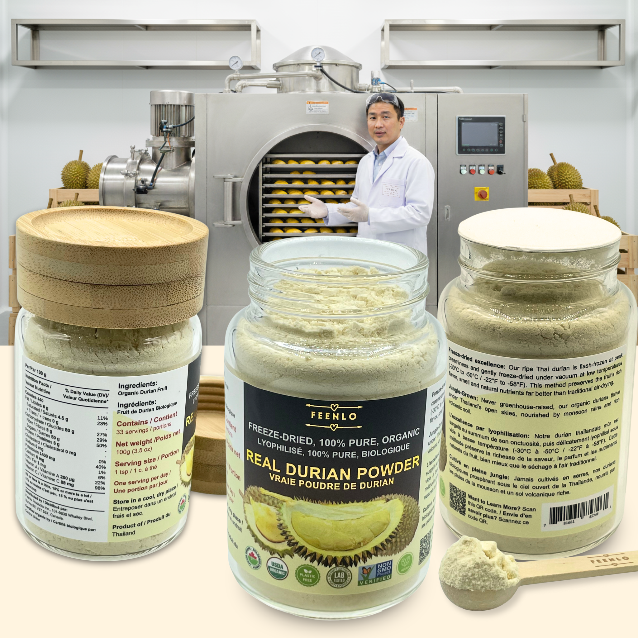 Freeze-drying is a industrial process that removes moisture from a product by freezing it first, and then using a vacuum to turn the ice directly into vapor. Because it uses very low temperatures (-40 degrees) and avoids heat, the process is able to preserve over 95% of their natural nutrients, vitamins, flavors, freshness and colors. Our freshly picked durian fruits are freeze-dried within 48 hours to lock in maximum freshness. Freeze-drying reduces the volume of fresh fruit by a 10-to-1 ratio. As a result, this jar contains the powder from approximately 1 kg (2.2 lbs) of fresh durian fruits.